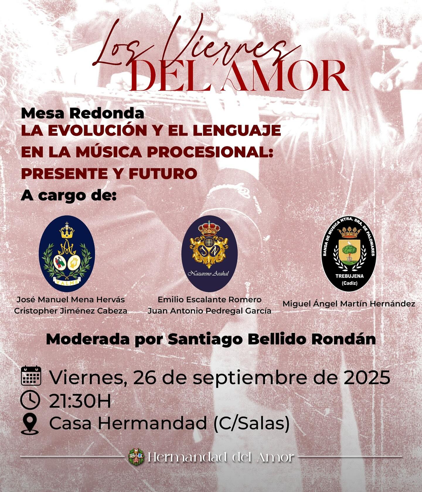 El próximo viernes 26 de septiembre a las 21:30h en la casa de hermandad del Amor en Calle Salas, septiembre llevará a cabo una mesa redonda sobre la evolución y el lenguaje en la música profesional. Moderada por Santiago Bellido Roldán y en la que intervendrán participantes de la Agrupación Musical Ntra. Sra. de Valme, de la Banda de Cornetas y Tambores de Nuestro Padre Jesús Nazareno de Arahal y de la Banda de Música de Ntra. Sra. de Palomares de Trebujena.
