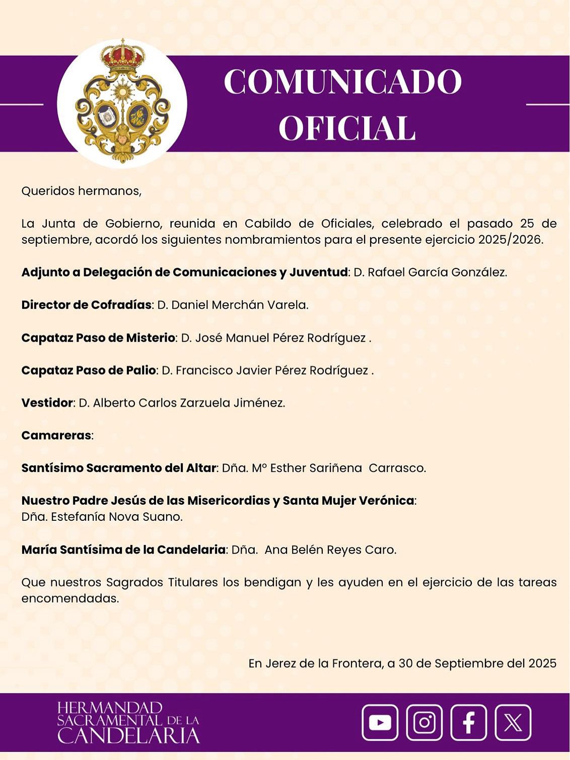 La Junta de Gobierno reunida en Cabildo de Oficiales ha realizado los siguientes nombramientos durante el curso 2025/2026.