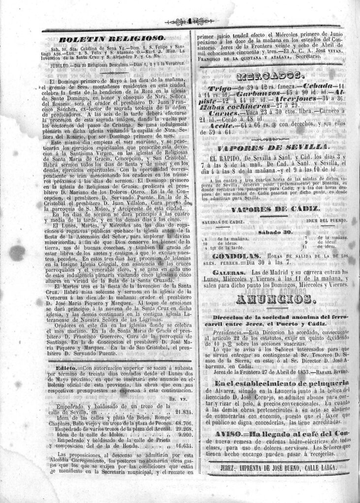 A continuación podemos ver una transcripción de la primera referencia a esta fiesta que encontramos en la prensa local. Ni más ni menos que una referencia en El Guadalete del 30 de abril de 1854.